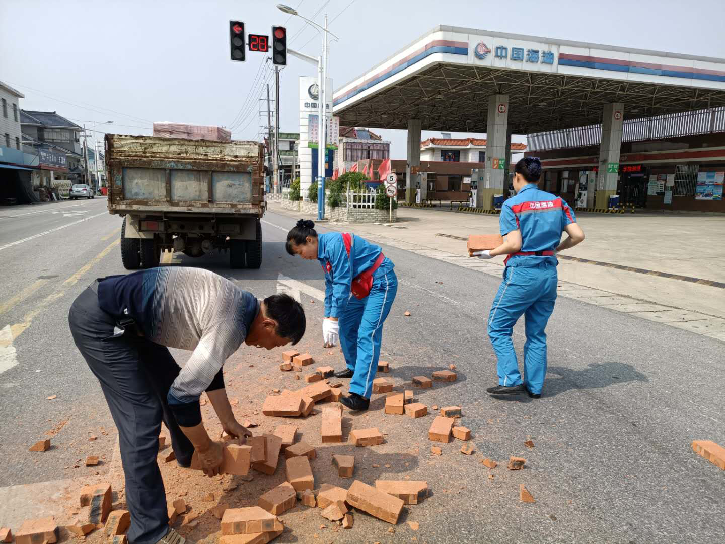 夏天的中午,天氣炎熱,似乎連樹上的知了也停止了歌唱。華東銷售南通公司栟茶加油站站前道路,似乎和往常一樣,車輛人流來來往往,當(dāng)班的繆小紅和蔡翠和頂著炎熱在加油島上等待下一個(gè)顧客來加油。突然,“吱呀~~~”一個(gè)急剎,一輛避讓行人的運(yùn)磚車差點(diǎn)翻車,晃悠了幾次總算停穩(wěn)了,但是車上的磚塊紛紛滾落。后方行駛的車輛有些來不及避讓,差點(diǎn)釀成新的事故,散落的磚塊對(duì)道路交通安全構(gòu)成隱患。司機(jī)驚魂未定,趕忙下車查看,立刻開始將散落在道路上的磚往車上搬。