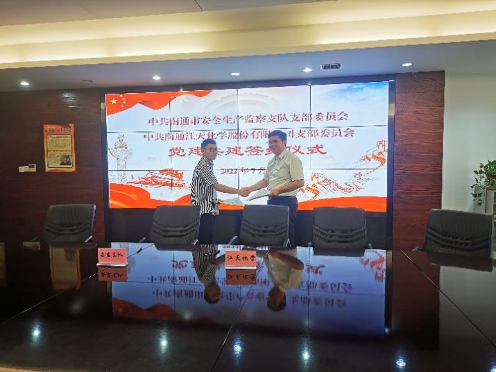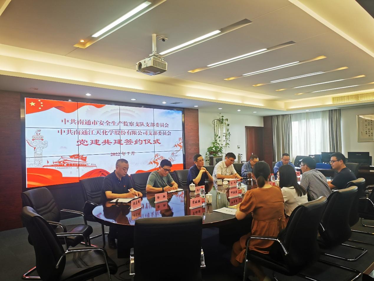 為認(rèn)真貫徹落實習(xí)近平總書記關(guān)于安全生產(chǎn)方面的重要論述,深化“紅色引領(lǐng) 綠色智造”黨建品牌建設(shè),深入推進(jìn)融合黨建實踐,提升安全生產(chǎn)管理工作成效。7月份,江天化學(xué)黨支部與南通市安全生產(chǎn)監(jiān)察支隊黨支部開展了黨建共建簽約儀式,進(jìn)一步加深合作交流,創(chuàng)新黨建結(jié)對共建形式。